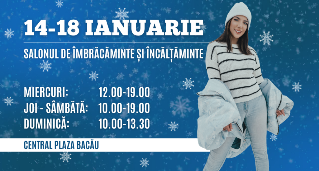 Targ imbracaminte si incaltaminte 14 – 18 ianuarie </h1 > Data evenimentului: 14 – 18 ianuarie 2026 Locatia desfasurarii evenimentului: Cladirea Central Plaza Bacau, sala “Targuri si Expozitii” Distribuie acest eveniment: Fiecare an nou vine cu dorința aceea de reîmprospătare, de a face loc în viața noastră pentru energie și planuri noi. Iar garderoba […]